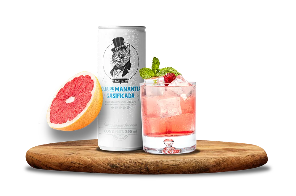 200ml de Agua Gasificada Gatier / 50 ml de Zumo de toronja / 1 frambuesa / 3 cubos Hielo / 1 Ramita de Menta.